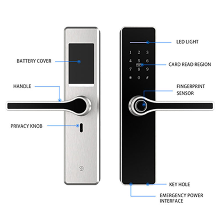 1. Prieiga per programą/pirštų atspaudas/kodas/kortelė/mechaninis raktas.2. Didelis jutiklinio ekrano skaitmeninės plokštės jautrumas.3. Suderinama su „TT Lock“ ar „Tuya“ programa.